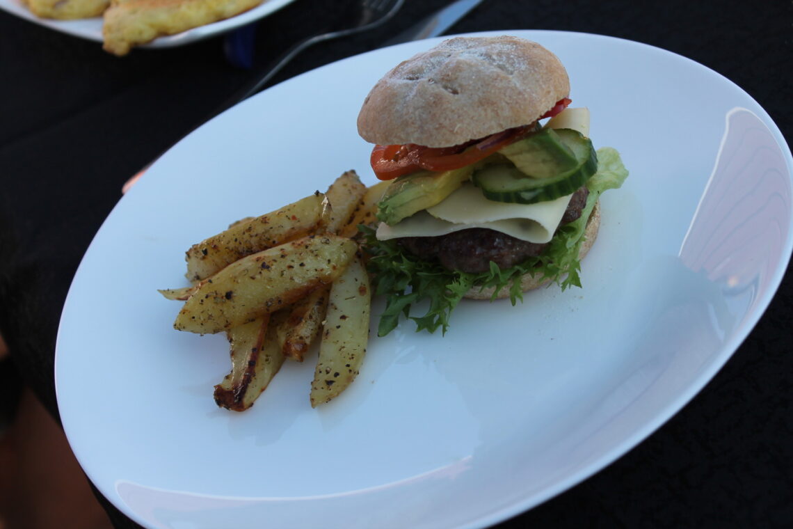 Server med hjemmelaget hamburgerbrød, frisk salat, avocado, tomat og stekte poteter.