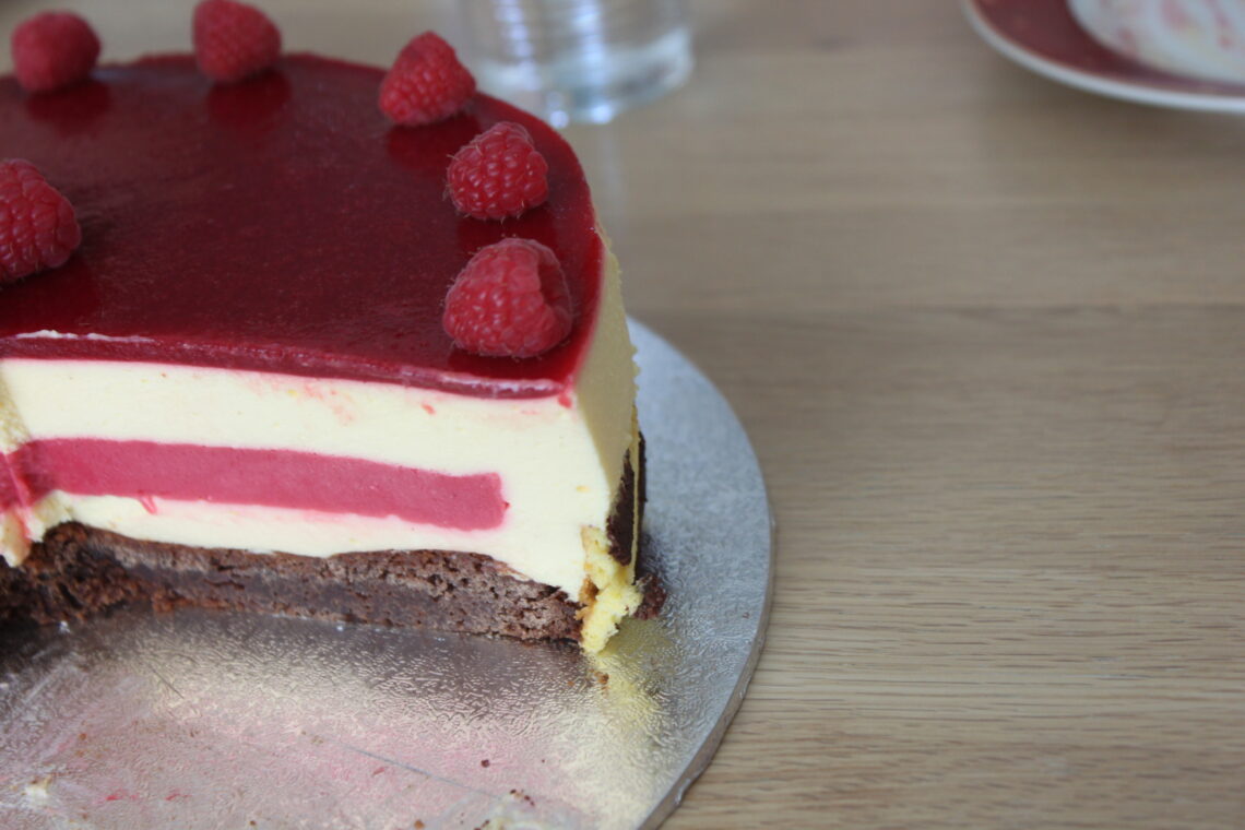 Det er mange trinn å følge her, men både dekorkant, browniebun og bringebærkjerne kan lages et par uker i forveien og fryses ned. Når man jobber seg gjennom et og et trinn er det ikke så vanskelig.