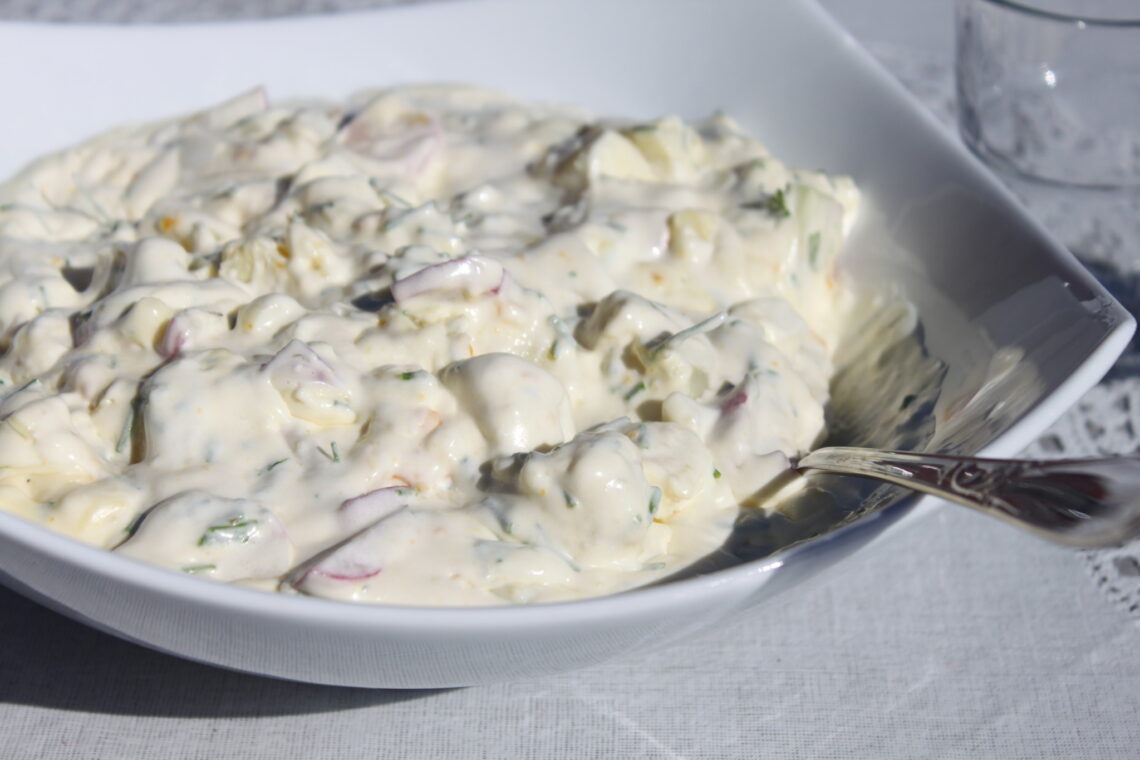 Bruksområdene er i alle fall mange og variasjonene uendelige. Her er oppskrift på en veldig enkel, kremet potetsalat med få ingredienser.