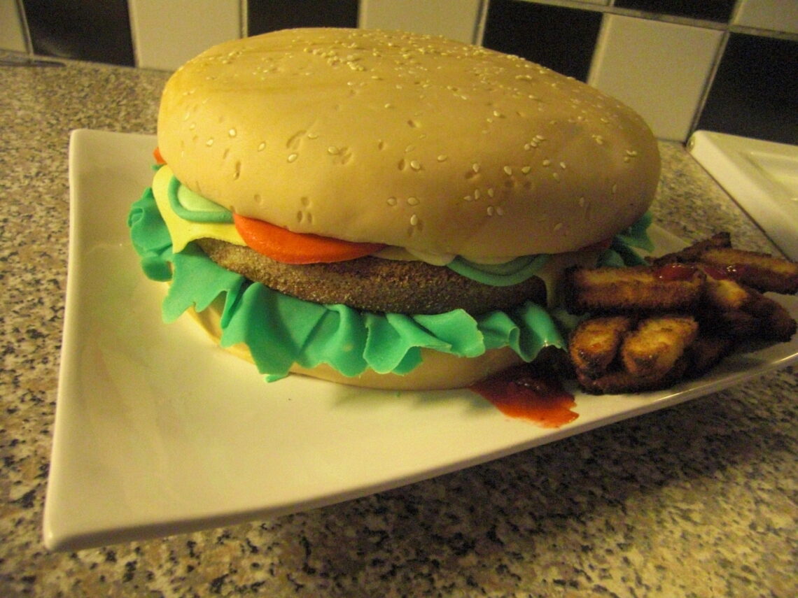 Dette er den første burgerkaka jeg lade, så fremgangsmåten er veldig enkel. Jeg brukte et sukkerbrød og 1/3 porsjon sjokoladekake. Du kan bruke hvilken kake du vil, men jeg synes det ble stilig å bruke «riktige farger» til bunnene.