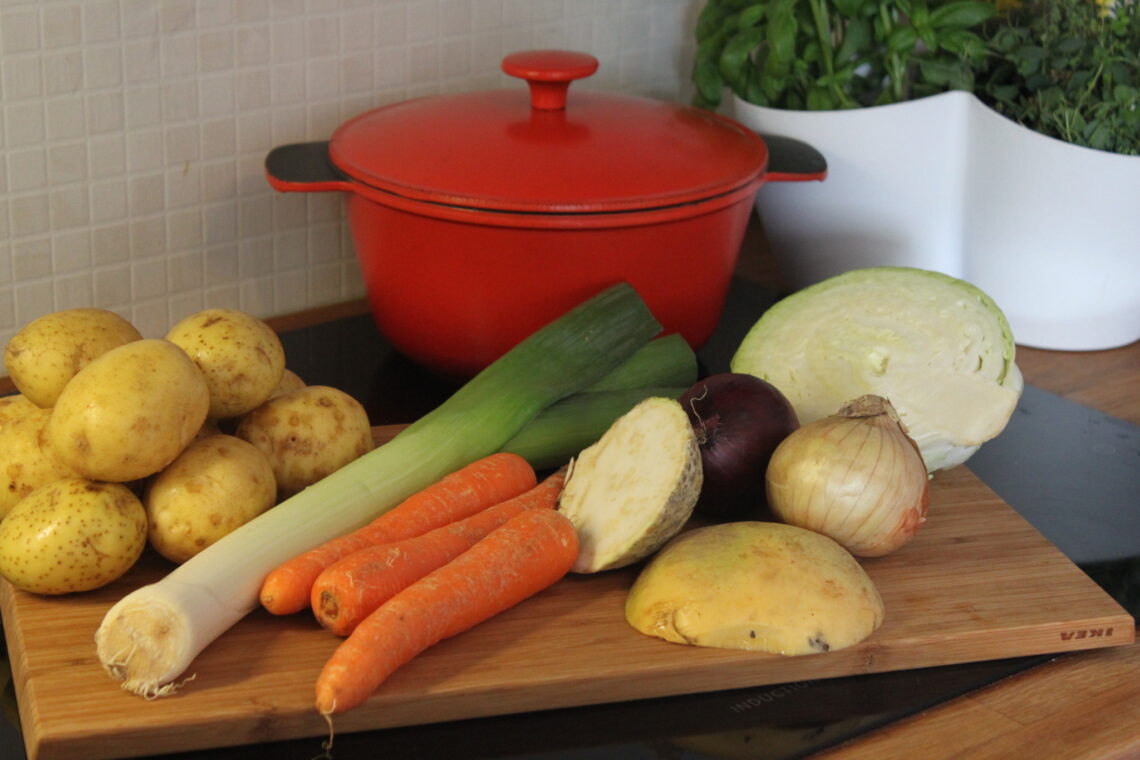 Fra barna var små, skar jeg alltid gulrøttene i «gullmynter», det har jeg bare fortsatt med, du kan gjerne kutte dem i terninger om du heller vil det. Kål, løk og purre grovhakkes, sellerirot og kålrot kuttes i små terninger, du kan også ta et par ekstra poteter og skjære dem i terninger.
