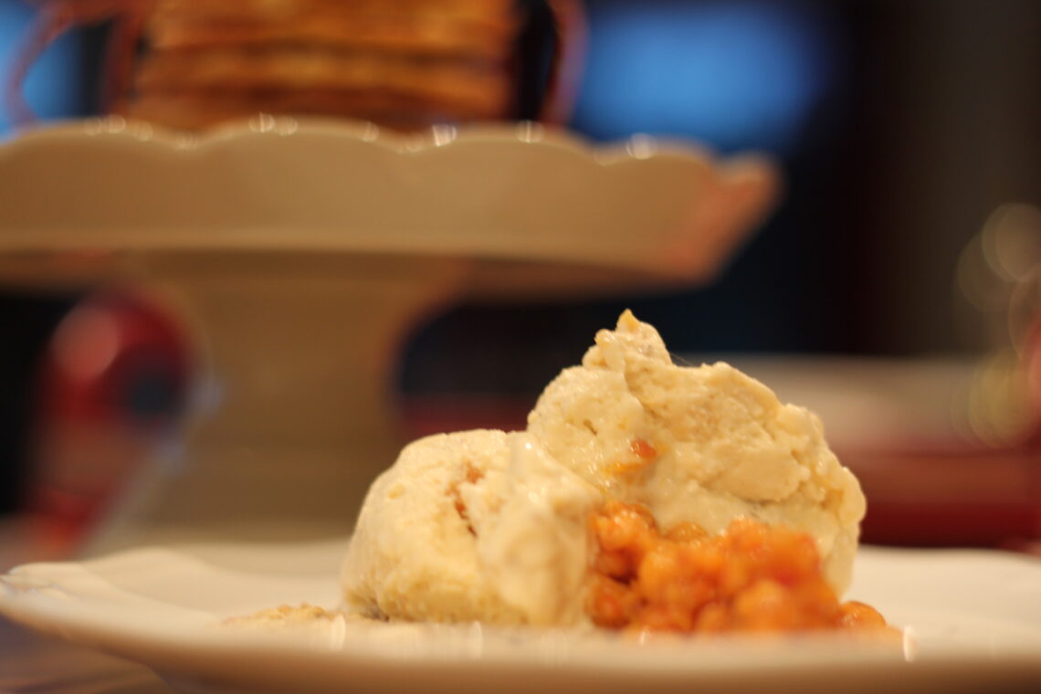 Hjemmelaget vanilje- og multeis servert med lune multer og knasende sprø havreflarn, nydelig dessert etter en god middag. I isen har jeg tilsatt litt multer som er flambert i cognac.