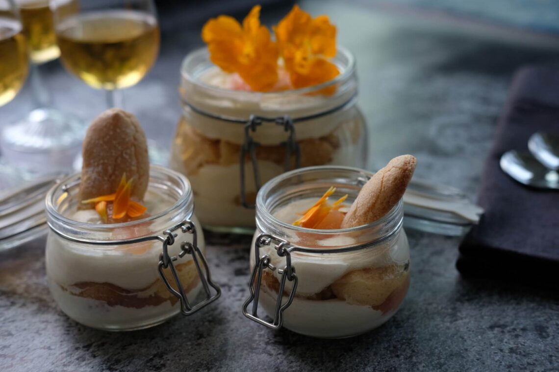 Dypp fingerkjeks i eplecider/eplejuice og legg i bunn av formene, ha over mascarponekrem, så et lag eplemos. Fortsett og legg dynkede fingerkjeks og krem lagvis, ha eplemos mellom lagene.