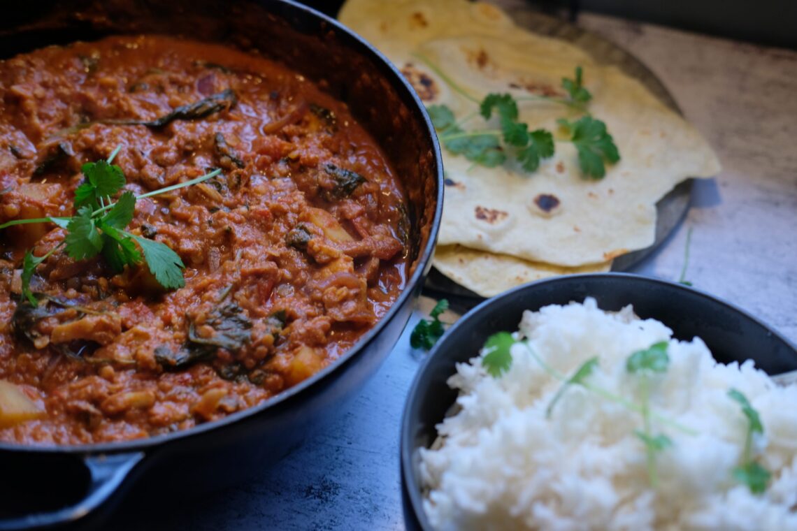 Server med ris, naan eller chapatti og gjerne litt koriander.