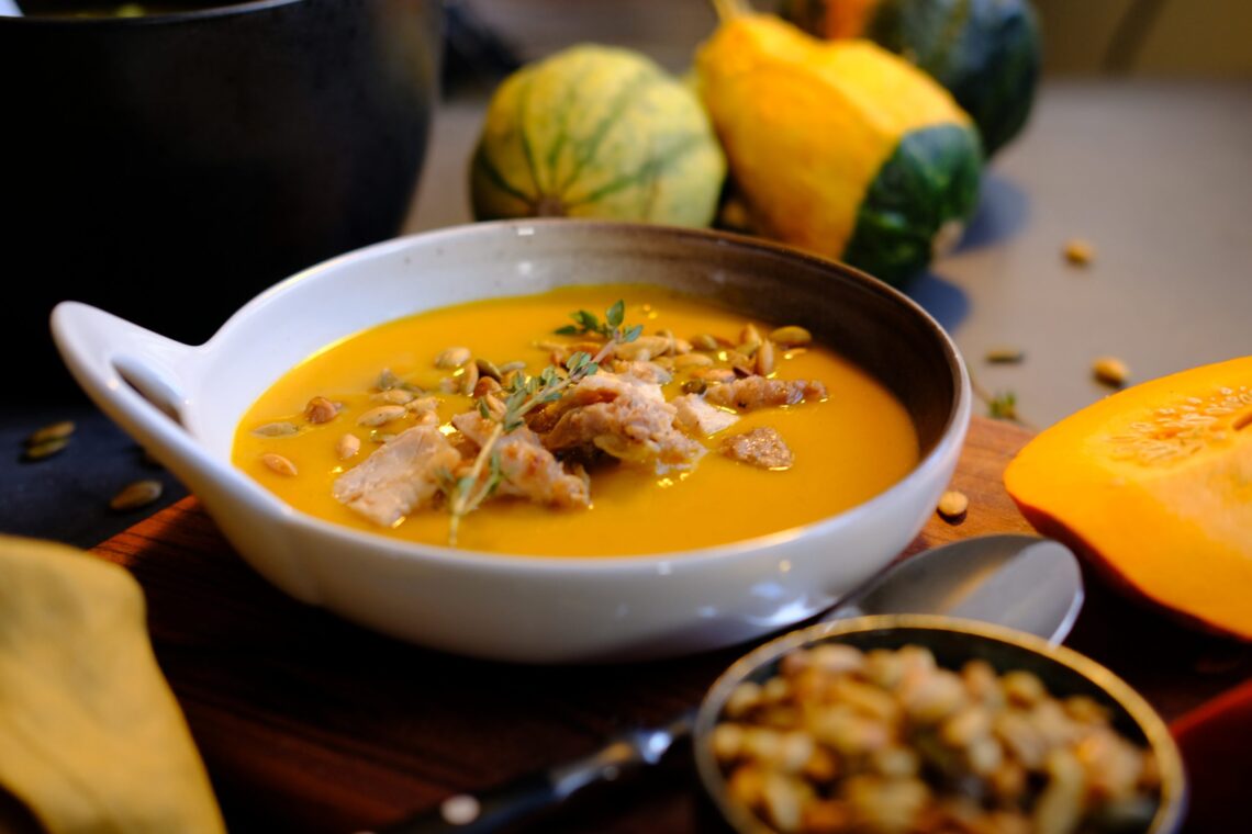 Server gjerne med en timiankvast, ristede, salte gresskarkjerner og krutonger.