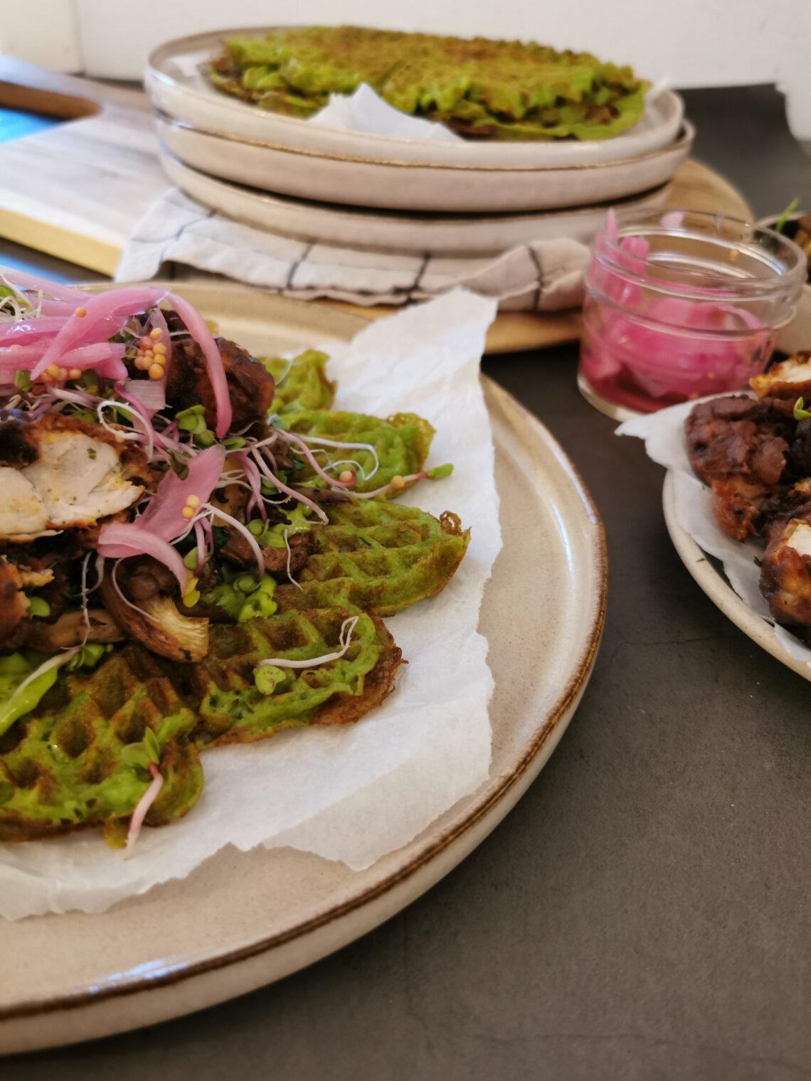 Prøv disse nydelige potet- ramsløk og spinat vaflene, du vil ikke angre. Kan serveres med mye ulikt tilbehør. Jeg har laget crispy, fritert kylling, sautert østerssopp med spinat, syltet rødløk, ramsløkmajo og reddikspirer. Det ble rene festmåltidet. Du kan og ta det helt ned og fylle i med spekeskinke, røkt laks eller eggerøre. Bruk det du liker og har tilgjengelig som tilbehør, ingen vitts å stresse på butikken om du har et par egg eller en pakke skinke liggende.