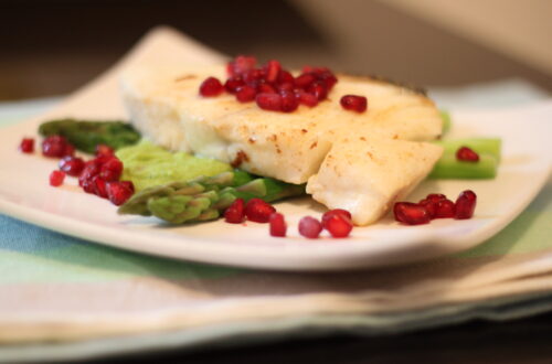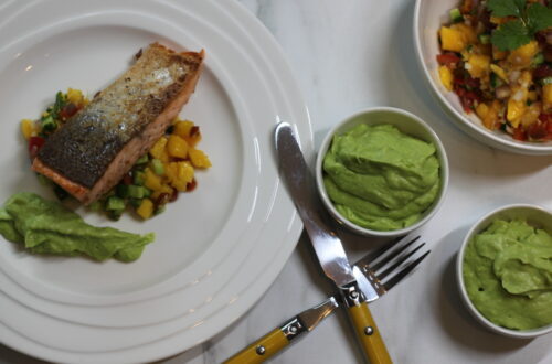 Pannestekt skrei med potetmos, bacon og ovnsbakte grønnsaker