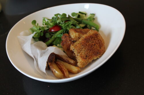 Fiskepinner med stekte poteter, frisk salat og remulade