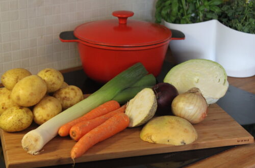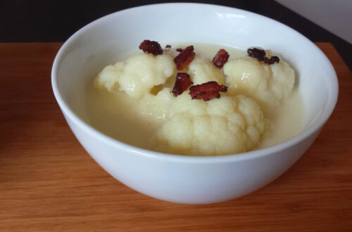 Pannestekt skrei med potetmos, bacon og ovnsbakte grønnsaker